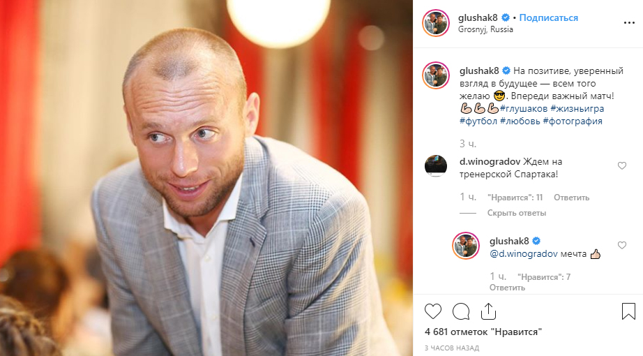 Глушаков опубликовал фотографию, под которой один из фанатов написал: "Ждём на тренерской "Спартака"!". На что Глушаков ответил: "Мечта".