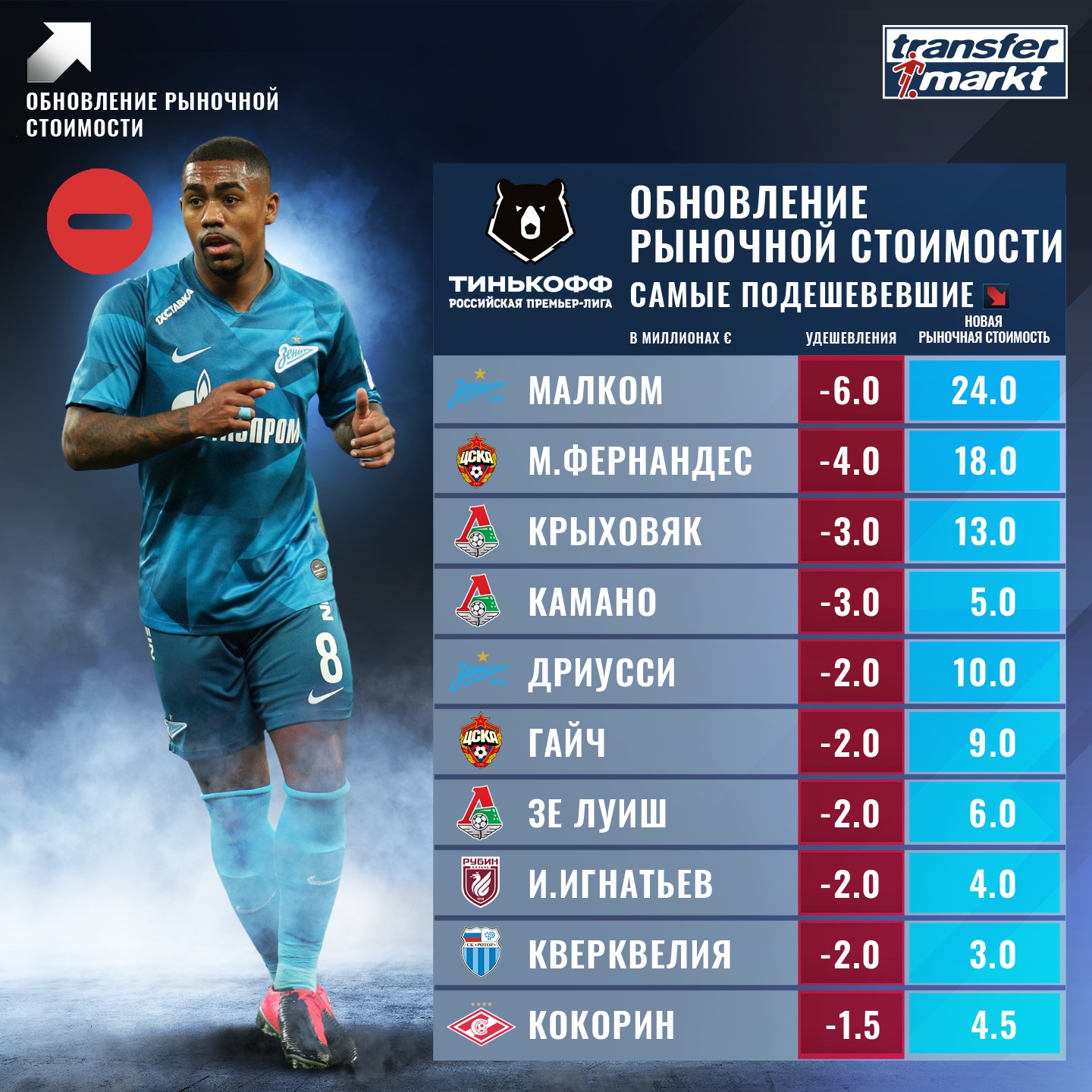 Что касается игроков, выступающих в РПЛ, то тут список возглавил бразилец Малком из "Зенита". Его "ценник" - 24 миллиона евро.