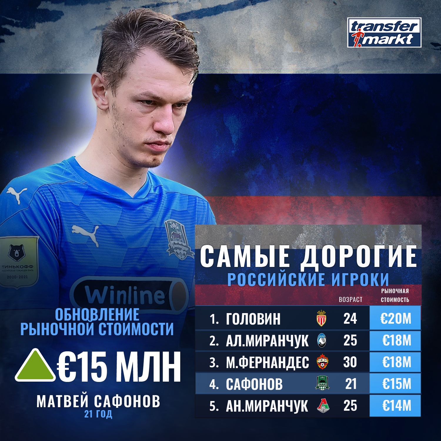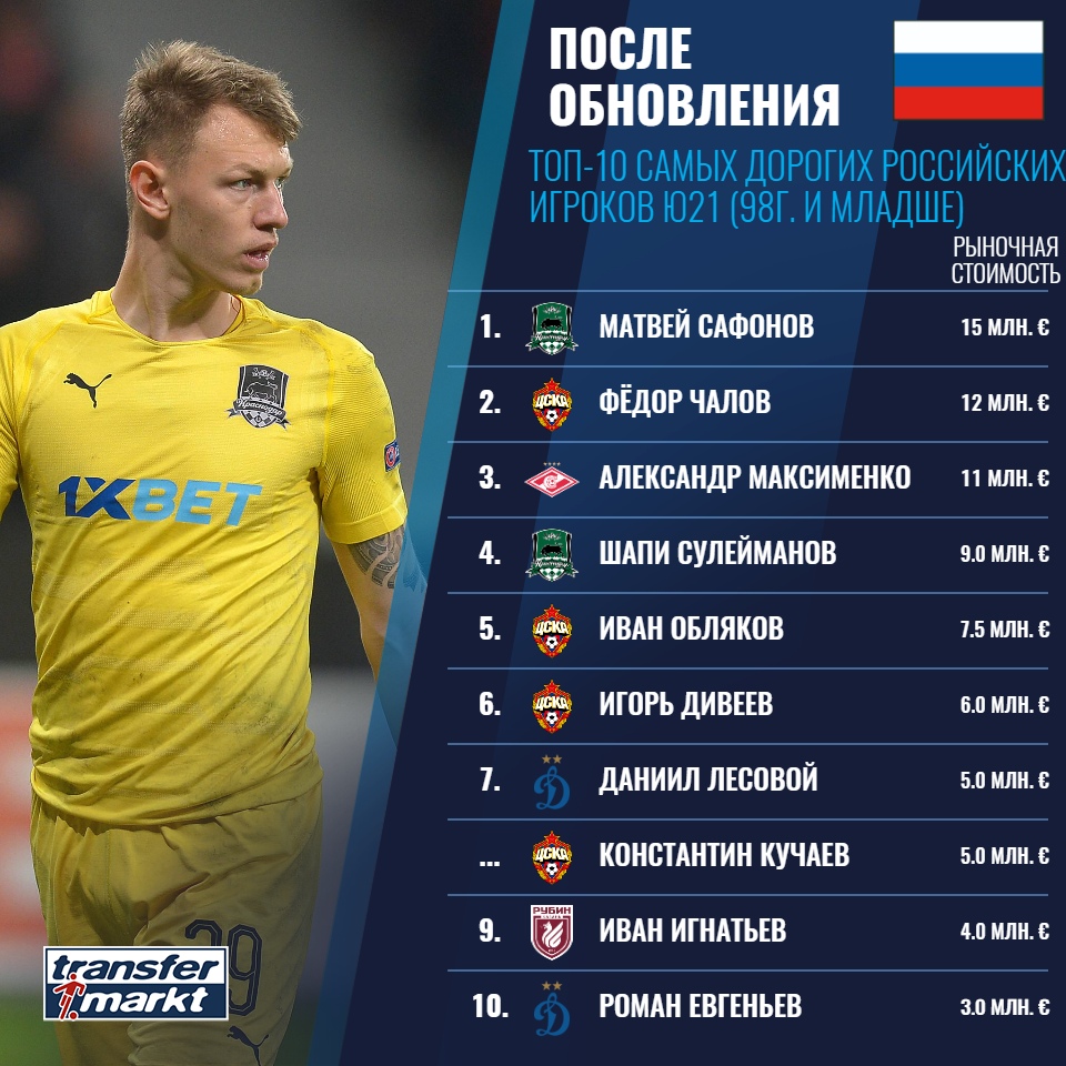 Самый дорогим молодым футболист является Матвей Сафонов из "Краснодара". По мнению журналистов Transfermаrkt, уже сегодня за трансфер краснодарца можно смело запросить более 15 миллионов евро.