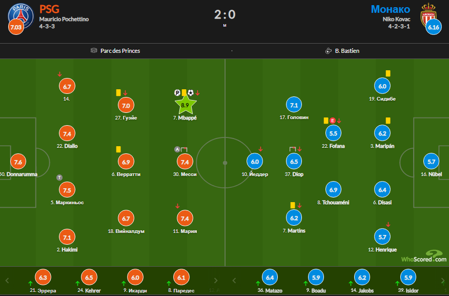 Головин в этом матче получил 7,1 балла по версии WhoScored. Оценка Мбаппе составила 8,9 балла.