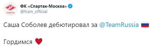 "Саша Соболев дебютировал за сборную России. Гордимся", - написала пресс-служба красно-белых.