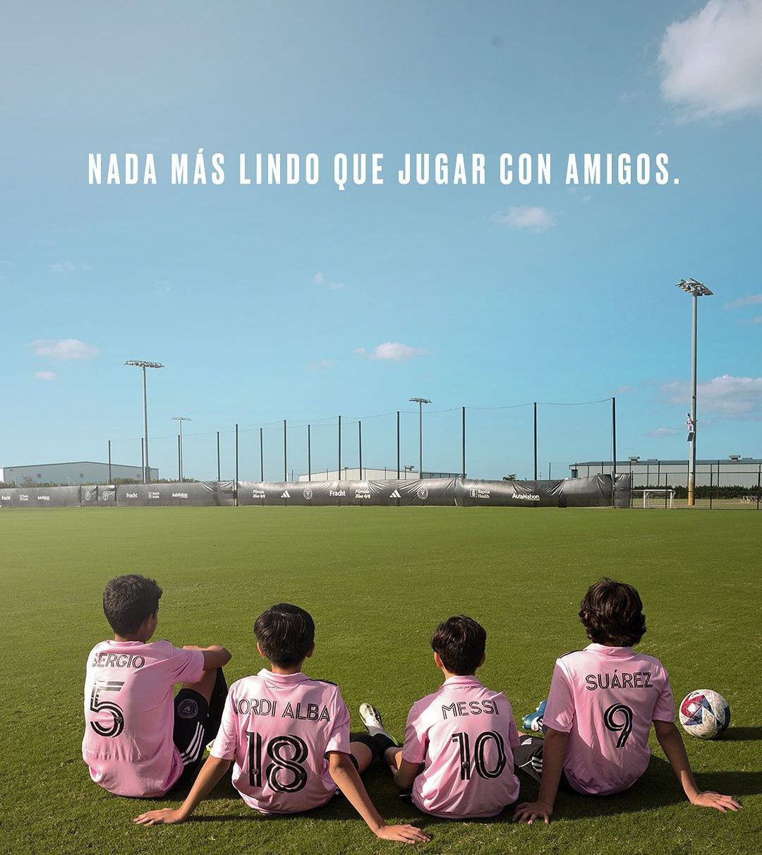 Юные футболисты сидят на поле рядом с друг другом и одеты в футболки своих звёздных родителей. На фотографии красуется надпись Nada mas lindo que jugar con amigos, что в переводе с испанского на русский означает: "Нет ничего прекраснее, чем играть вместе с друзьями".