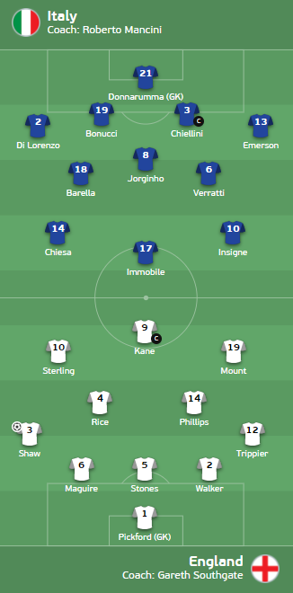 Что касается англичан, то они не спешили раскрываться с первых игр континентального первенства. На групповом этапе они с минимальным счётом одолели Чехию и Хорватию, а также провели безголевую ничью с Шотландией. В матч 1/8 финала сборная Англии обыграла сборную Германии со счётом 2:0, а в 1/4 финала ничего не оставила от сборной Украины – 4:0. В полуфинальном поединке подопечные Гарета Саутгейта со счётом 2:1 в овертайме переиграли датчан. Стоит отметить, что все матчи кроме четвертьфинала англичане проводили на домашнем стадионе "Уэмбли".