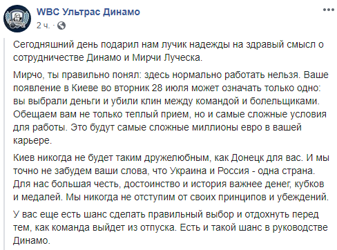 Жёсткое заявление ультрас "Динамо" в адрес Луческу