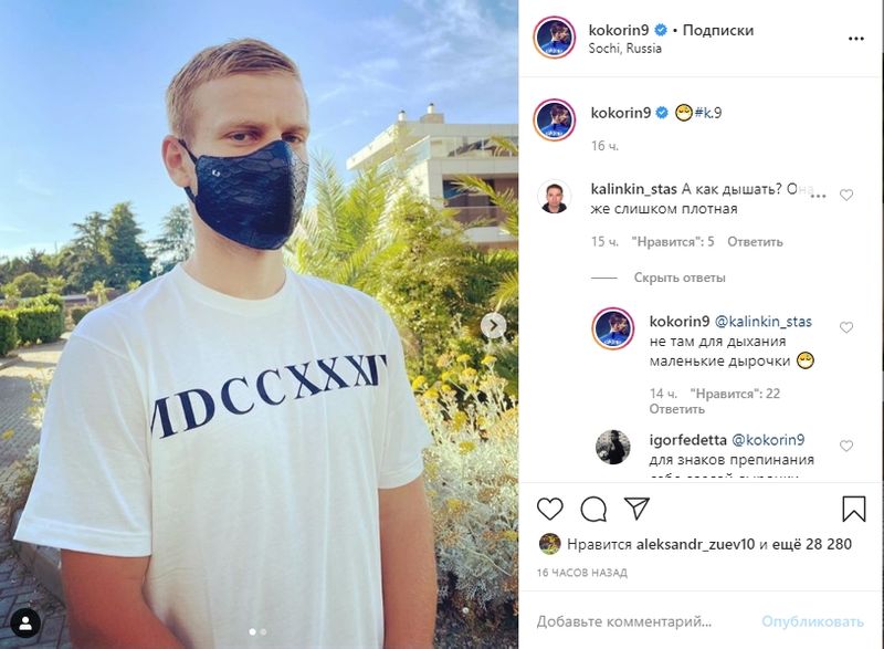 Нападающий "Сочи" Александр Кокорин приобрёл необычные маски. Футболист поделился фотографией в "инстаграме".