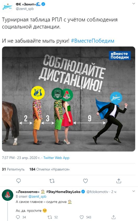 "А самое главное – сидите дома. Ах да, простите", – прокомментировал картинку в твиттере "Локомотив".