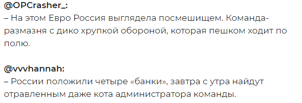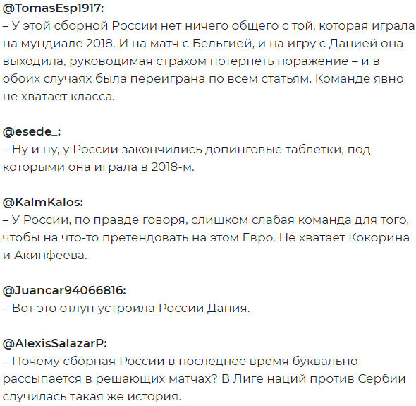 Поражение российской команды, которая во втором тайме матча с Данией играла только у собственных ворот, произвело весьма негативное впечатление на англоязычных поклонников футбола, которые в западном сегменте Twitter устроили настоящий разнос дружине Черчесова.
