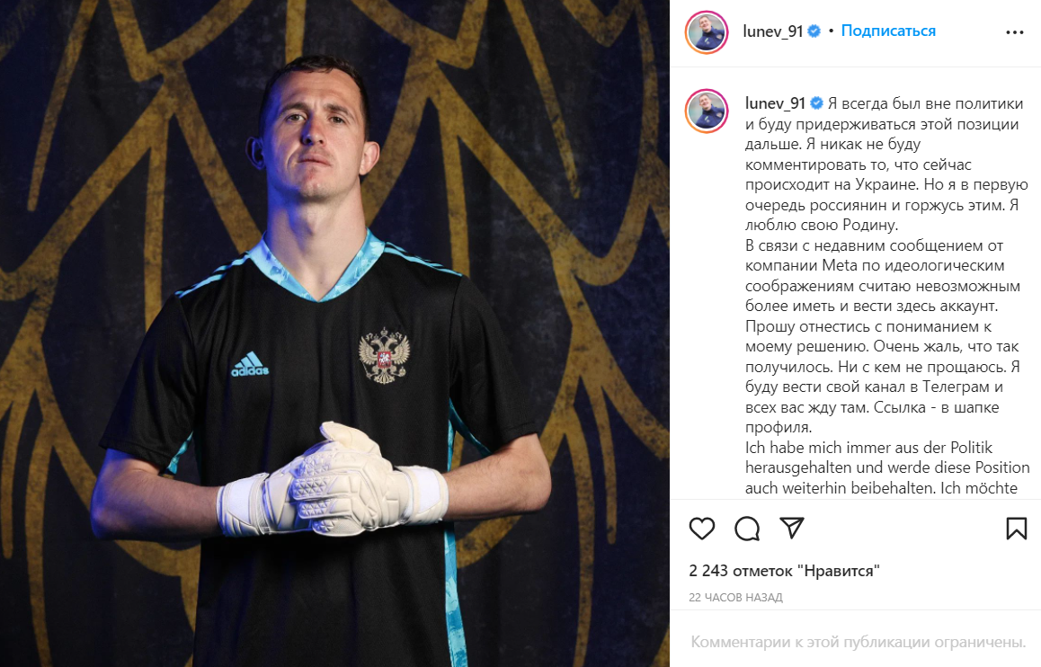 Sport.ru/ Футбол. Не так давно российский голкипер леверкузенского "Байера" Андрей Лунёв принял важное решение. Он объявил, что больше не будет вести свою страницу в Instagram. Это связано с тем, что в сложившихся политических условиях компания Meta, владеющая Instagram, разрешила призывы к агрессии в отношении россиян. Отметим, что в России с сегодняшнего дня, 14-го марта, Instagram был заблокирован.