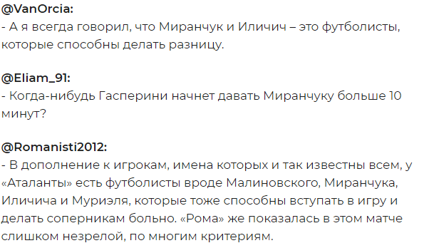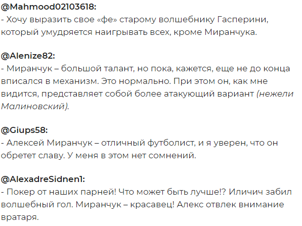 Российский полузащитник Алексей Миранчук, на которого местные фанаты возлагают большие надежды, вышел на поле только под занавес поединка, однако успел произвести благоприятное впечатление на болельщиков команды из Бергамо, который сразу после матча в зарубежном сегменте Twitter оценили игру бывшего железнодорожника.