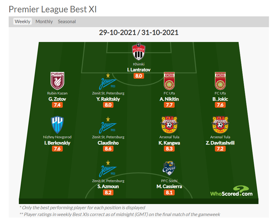 В понедельник, первого ноября, популярный портал WhoScored опубликовал свою версию символической сборной лучших игроков 13 тура первенства России по футболу