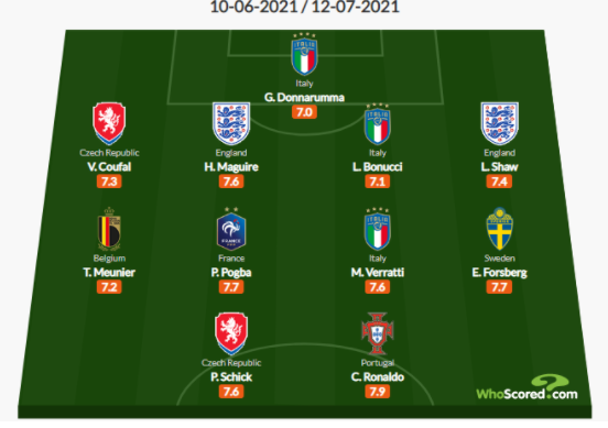 Сборная чемпионата Европы: Джанлуиджи Доннарумма (Италия, 7,0), Владимир Цоуфал (Чехия, 7,3), Гарри Магуайр (Англия, 7,6), Леонардо Бонуччи (Италия, 7,1), Люк Шоу (Англия, 7,4), Тома Мёнье (Бельгия, 7,2), Поль Погба (Франция, 7,7), Марко Верратти (Италия, 7,6), Эмиль Форсберг (Швеция, 7,7), Криштиану Роналду (Португалия, 7,9), Патрик Шик (Чехия, 7,6).
