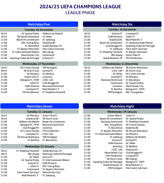 На официальном сайте Союза европейских футбольных ассоциаций (УЕФА) опубликовано полное расписание матчей общего этапа Лиги чемпионов сезона 2024/2025
