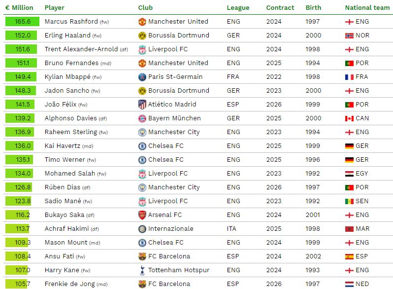Так, на первой строчке оказался форвард "Манчестер Юнайтед" Маркус Рашфорд, которого оценили в € 165,6 млн.