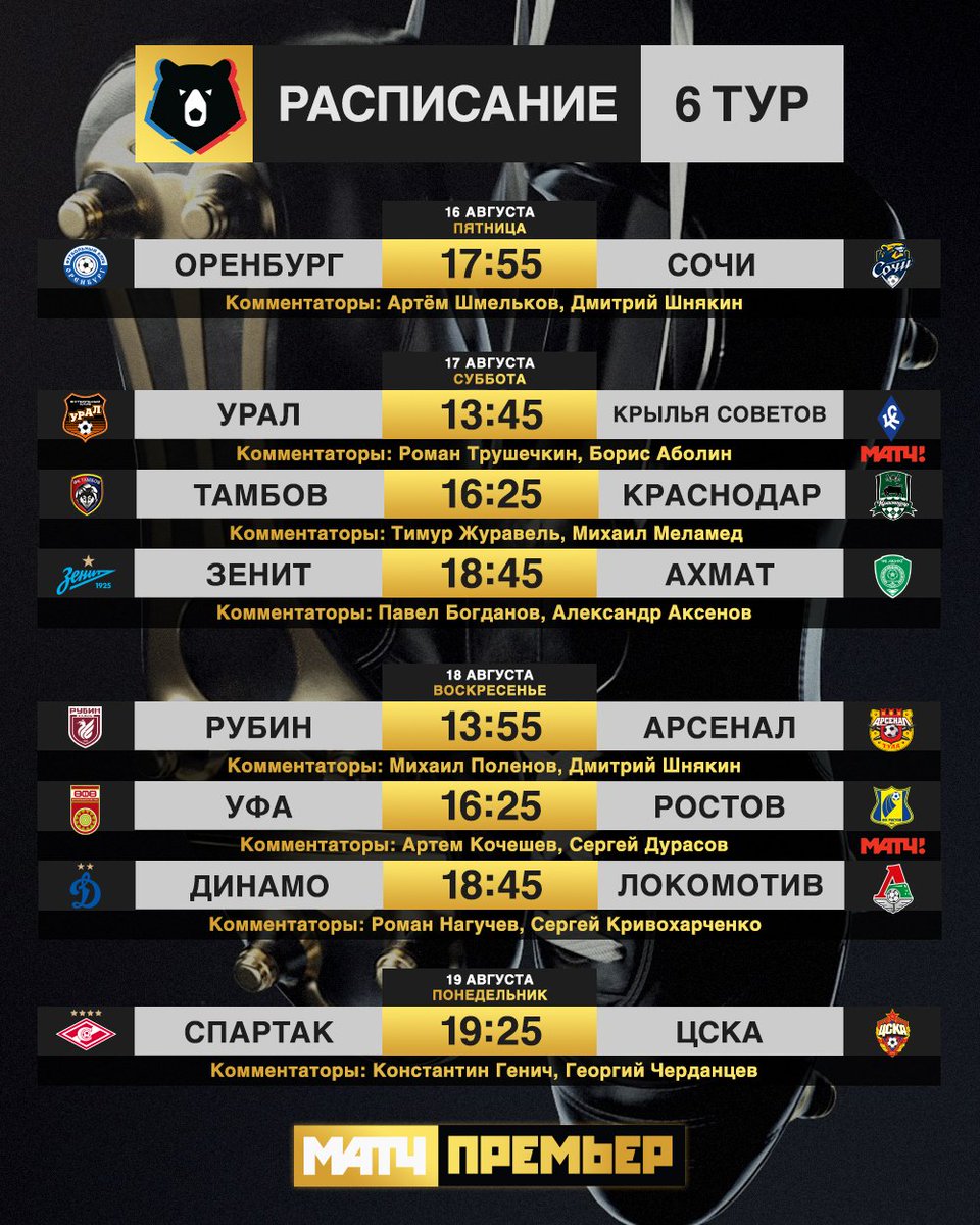 Расписание трансляций и список комментаторов 6-го тура РПЛ
