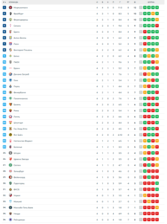 Со 100% показателем набранных очков по турниру пока продолжает идти лишь датский "Мидтьюлланд". По 10 баллов в четырёх турах набрали немецкий "Фрайбург" и венгерский "Ференцварош".