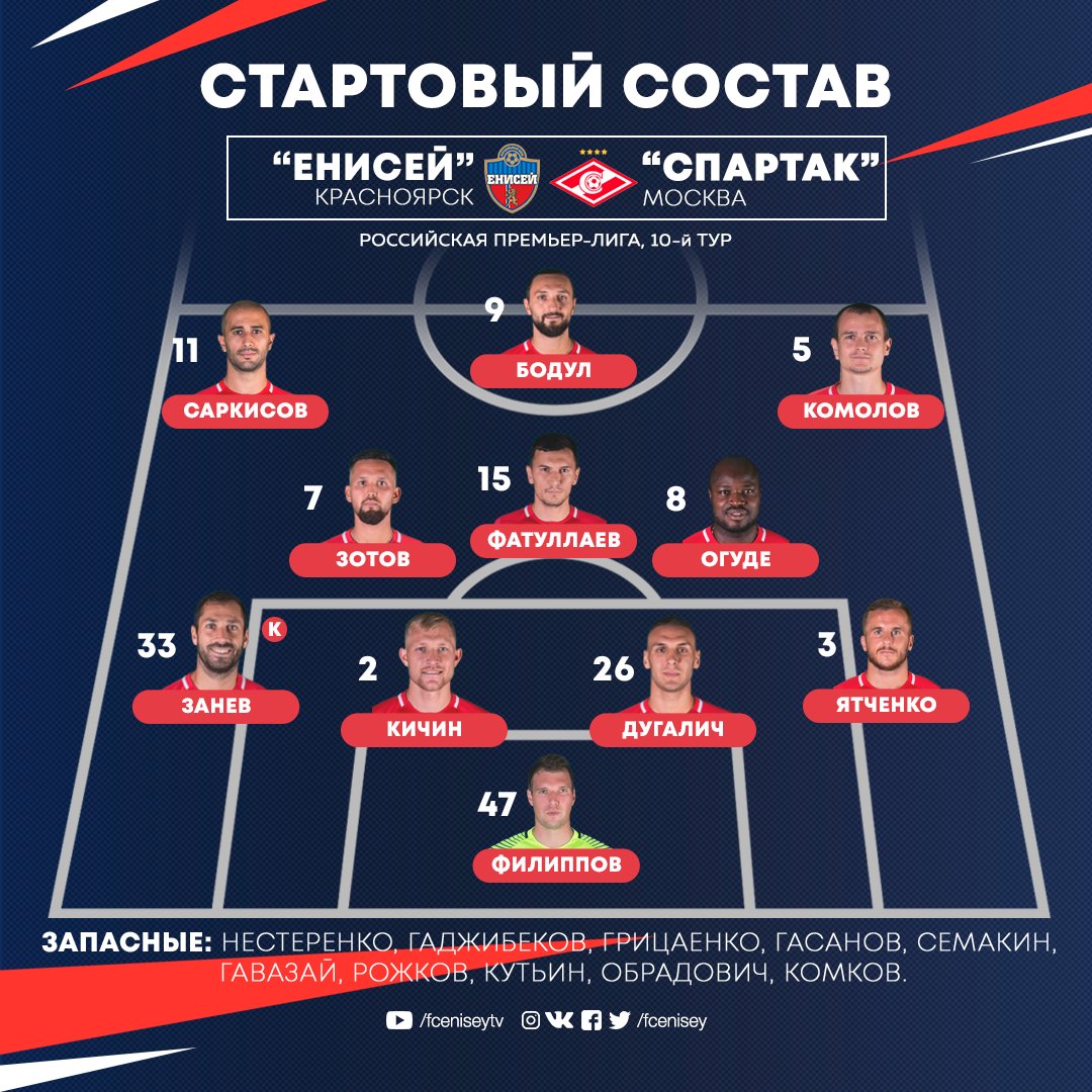 "ЕНИСЕЙ": 47 Филиппов - 33 Занев (к), 2 Кичин, 26 Дугалич, 3 Ятченко - 7 Зотов, 15 Фатуллаев, 8 Огуде - 11 Саркисов, 9 Бодул, 5 Комолов