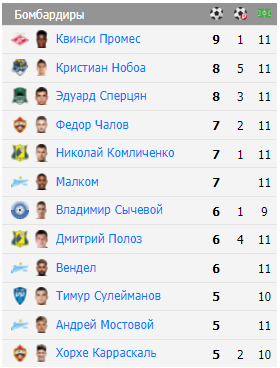 Что касается гонки бомбардиров, тот тут есть единоличный лидер - Квинси Промес из "Спартака". На счету голландского футболиста уже девять мячей (один с пенальти).