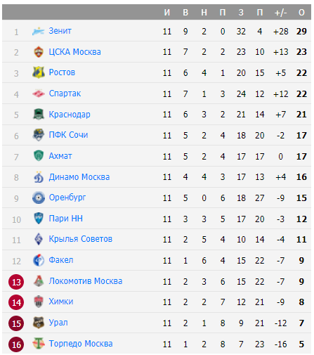 Полностью турнирная таблица чемпионата России на текущий момент выглядит следующим образом: