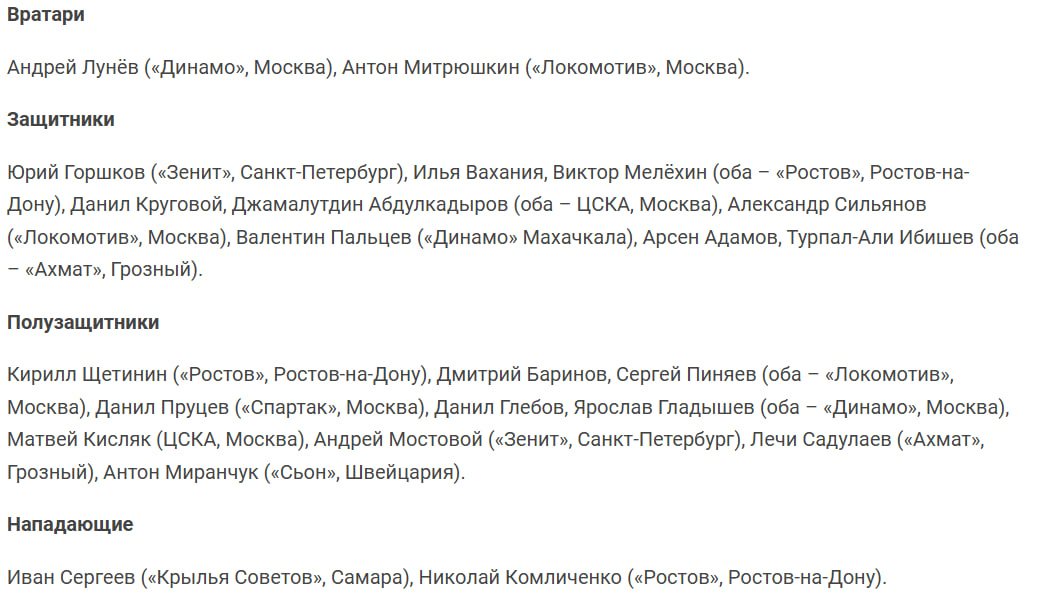 На официальном сайте РФС был опубликован список из 23 игроков, которые полетели в Минск со сборной России. Некоторые игроки, принимавшие участие в матче с Нигерией пропустят игру.