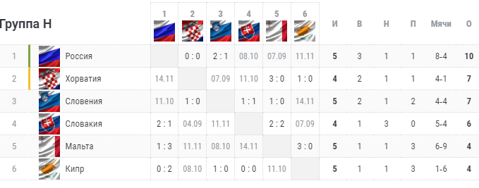 Уже сегодня вечером свой матч проведёт сборная Хорватии, которая может обойти россиян, если победит на выезде Словакию.