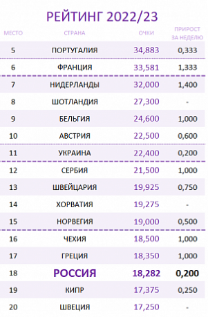 В рейтинге 22/23 (на текущий момент) мы упали уже на 18-е место: Россию обходят Чехия, Греция, Украина и другие ассоциации, которым, чтобы перешагнуть через России официально, всего-навсего нужно дождаться мая, когда с России снимут вышеупомянутые 12,6 баллов, заработанные в сезоне 17/18.