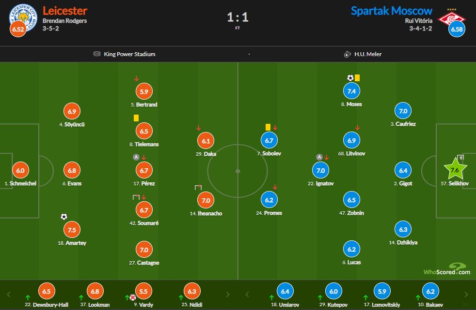 Несмотря на фактор гостевого поединка, московский "Спартак" всё же смог первым открыть счёт в матче после гола Виктора Мозеса (на 51-й минуте). Семь минут спустя "Лестер" сравнял счёт усилиями Даниэля Амарти.