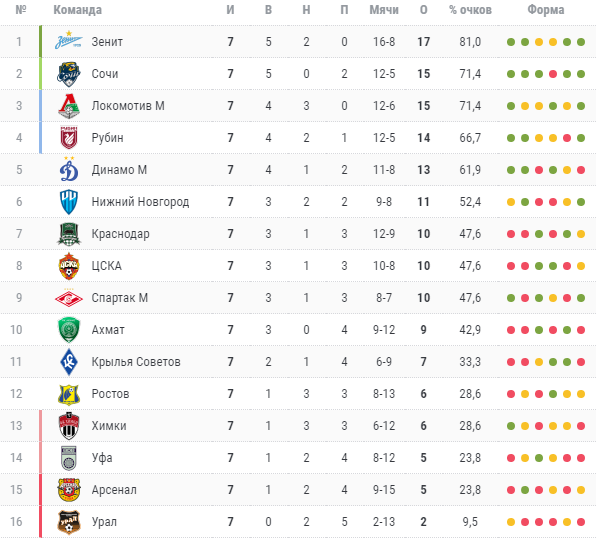 "Спартак", одержавший победу над "Химками" (3:1), поднялся на девятое место. На дне турнирной таблицы продолжает находиться "Урал", набравший за семь туров всего два очка.
