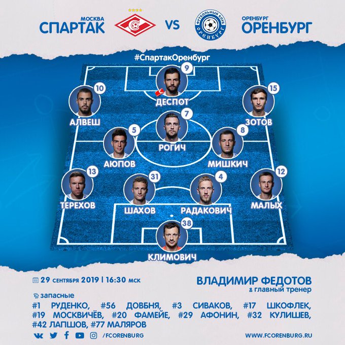 "Спартак" - "Оренбург": стартовые составы команд