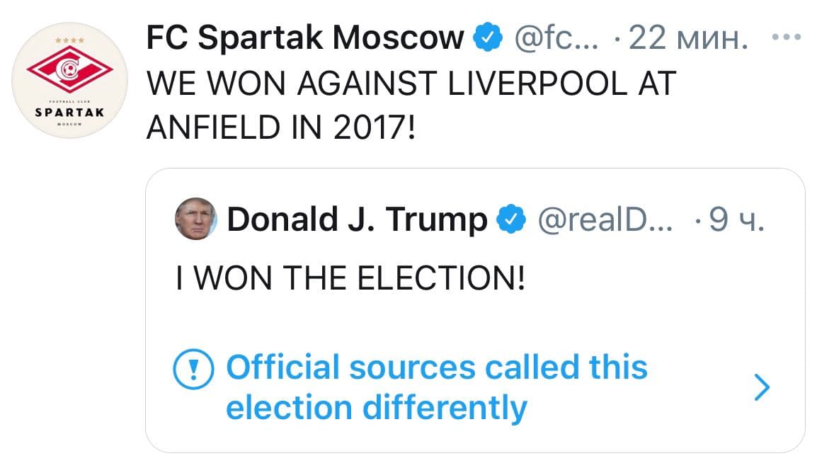 В ответ пресс-служба "Спартака" потроллила Трампа в Twitter, написав: "А мы победили "Ливерпуль" на "Энфилде" в 2017 году". Та встреча закончилась со счётом 7:0 в пользу англичан.