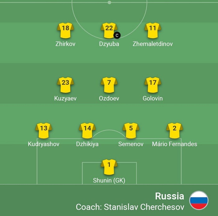 Состав сборной России: Шунин, Кудряшов, Джикия, Семёнов, Марио Фернандес, Оздоев, Головин, Кузяев, Жемалетдинов, Дзюба, Жирков.