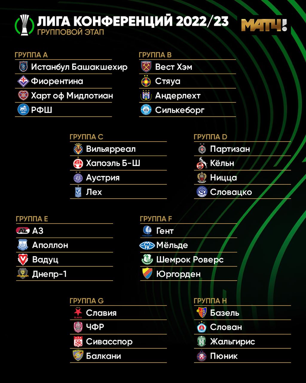 Sport.ru/ Футбол. Сегодня, 26-го августа, была проведена жеребьёвка группового этапа Лиги конференций УЕФА. Стали известны составы всех восьми групп.