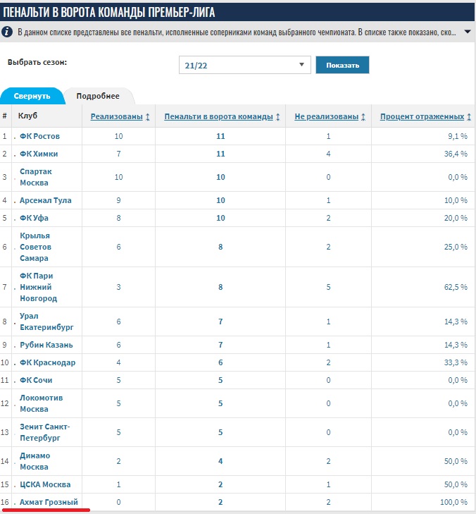В данной таблице отражены клубы РПЛ, в ворота которых чаще всего в прошлом сезоне назначались пенальти. Посмотрите, на каком месте в ней находится "Ахмат". За весь прошлый сезон в ворота команды из Грозного было назначено всего два (!) пенальти. Это последний, наряду с ЦСКА, показатель в лиге.