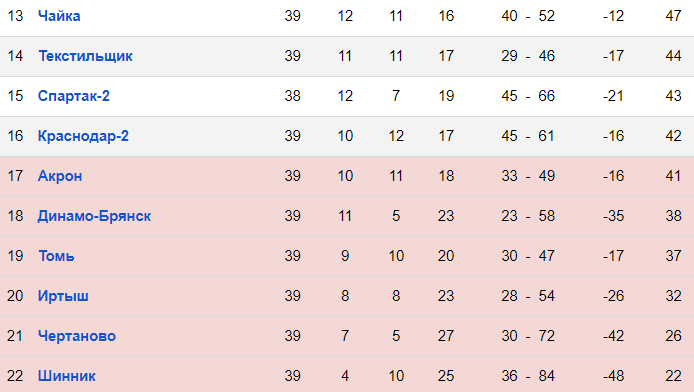 "Шинник", "Чертаново" и "Динамо-Брянск" уже вылетели в ПФЛ. "Иртыш" - в шаге от вылета. Но также ещё есть неопределённость с "Чайкой", которую могут наказать за договорной матч, снять с чемпионата или лишить очков, из-за чего клуб вылетит в ПФЛ. Исходя из этого 17-е место также может стать спасительным.