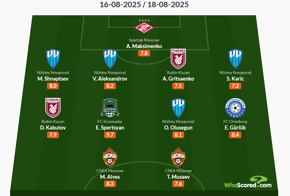 Sport.ru/Футбол. Авторитетный портал Whoscored опубликовал символическую сборную лучших игроков 5-го тура Российской Премьер-Лиги. В неё вошли сразу четыре футболиста «Пари НН» и двое представителей казанского «Рубина».