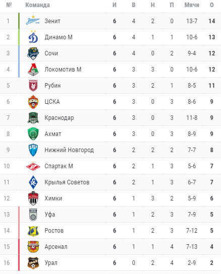 Таким образом, после шести туров "Зенит", заработавший 14 очков, единолично возглавляет таблицу РПЛ, "Динамо" с 13-ю баллами в активе на втором месте, замыкают тройку лидеров футболисты с берегов Чёрного моря - в активе ФК "Сочи" 12 очков. Столько же баллов заработал и столичный "Локомотив", уступающий сочинцам по дополнительным показателям.