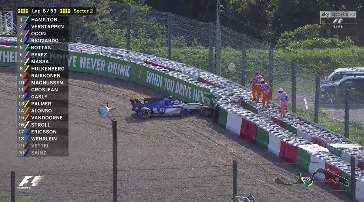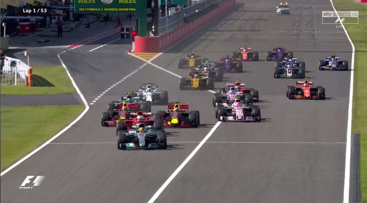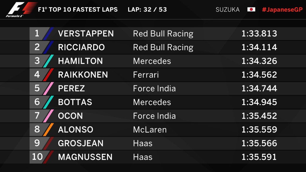 На двадцатом круге дистанции первая пятёрка выглядит так: Льюис Хэмилтон (Mercedes), Макс Ферстаппен и Даниэль Риккиардо (Red Bull), Валттери Боттас (Mercedes), Эстебан Окон (Force India).