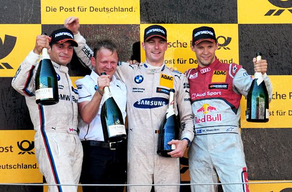 На пресс-конференции Мартен с радостью делился эмоциями от первой победы в своем дебютном сезоне DTM: "Это потрясающие эмоции! Я до сих пор не осознал их до конца. Знаете, я никогда не хотел выступать в Формуле-1, меня всегда привлекали другие гонки. И победа в DTM – это просто невероятно! Сегодня у нас была верная тактика и прекрасная машина, а команда отлично провела пит-стоп". – улыбался гонщик. – "Я вёл свою гонку, не смотрел на других, и лишь выезд машины безопасности заставил меня поволноваться, так как я был на жестких шинах. Но мне вновь удалось создать небольшой отрыв – и победить. Я очень рад за BMW, которой удалось сегодня завоевать победный дубль". Победный дубль BMW обеспечил чемпион 2012 Бруно Спенглер, стартовавший со второго места. Замкнул тройку Маттиас Экстрём, совершивший маленькое чудо за сорок шесть кругов – с одиннадцатого места он прорвавлся на третью ступень пьедестала. "Субботняя неудача стала для нас сюрпризом, но мы знали, что по скорости машина позволяет бороться за места в первой пятёрке", – отметил швед. – "Свою гонку я никак не могу назвать скучной. Первые круги прошли в постоянной борьбе, потом у нас был отчаянный поединок с Тимо Глоком. Ещё две позиции я отыграл, когда прямо передо мной столкнулись Адриен Тамбэ и Майк Роккенфеллер. Так что, надеюсь, сегодня мне удалось порадовать болельщиков. Это наш второй подиум в сезоне, теперь мы будем бороться за первую победу".