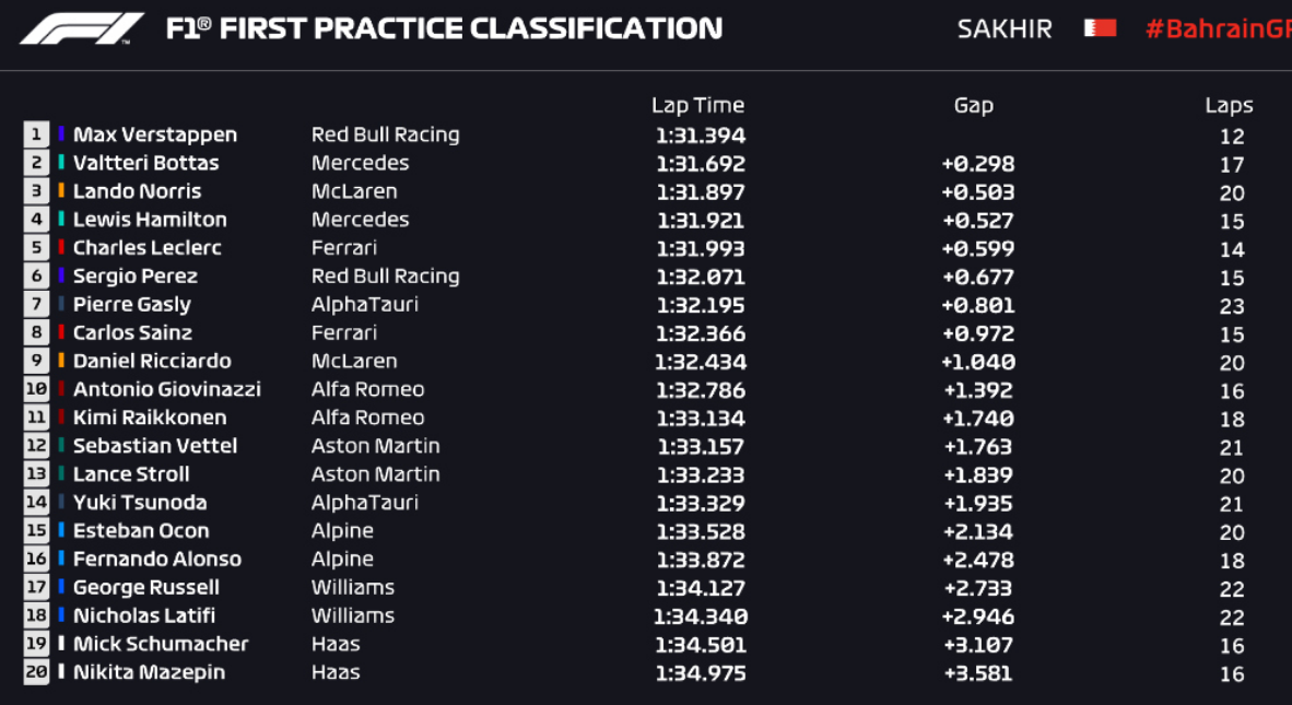 Лучший результат показал представитель команды "Ред Булла" Макс Ферстаппен. Вторы стал пилот "Мерседеса" Валттери Боттас. Тройку лидеров в пятницу замкнул Ландо Норрис, представляющий "Макларен".