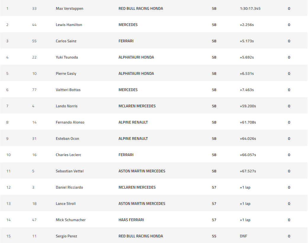 Второе место занял пилот "Мерседеса" Льюис Хэмилтон. Третьим к финишу приехал представитель "Феррари" Карлос Сайнс.