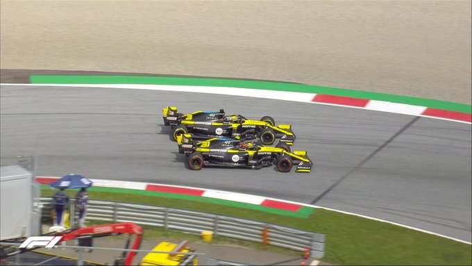 Стролл (Racing Point) подкрадывается к Риккардо (Renault). Не везёт сегодня французской команде.