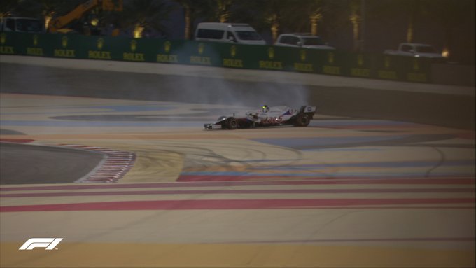 Никита Мазепин (Haas) допускает ошибку на третьем секторе и совершает разворот. К счастью, болид не заглох и россиянин самостоятельно вернулся на трассу.