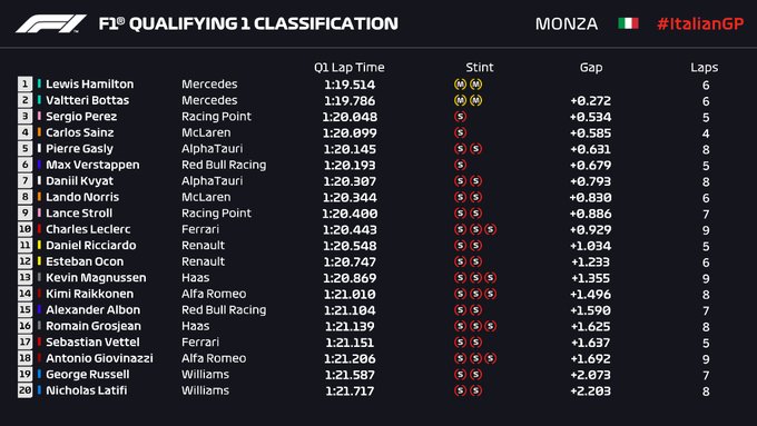 В заключительный сегмент квалификации не проходят: Даниил Квят (Alpha Tauri), Эстебан Окон (Racing Point), Шарль Леклер (Ferrari), Кими РАйкконен (Alfa Romeo) и Кевин Магнуссен (Haas).