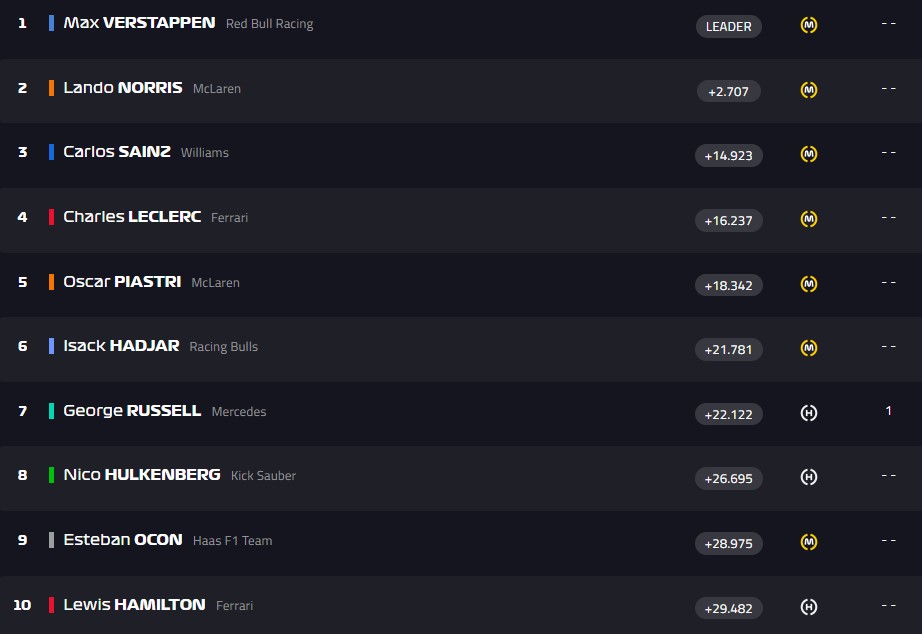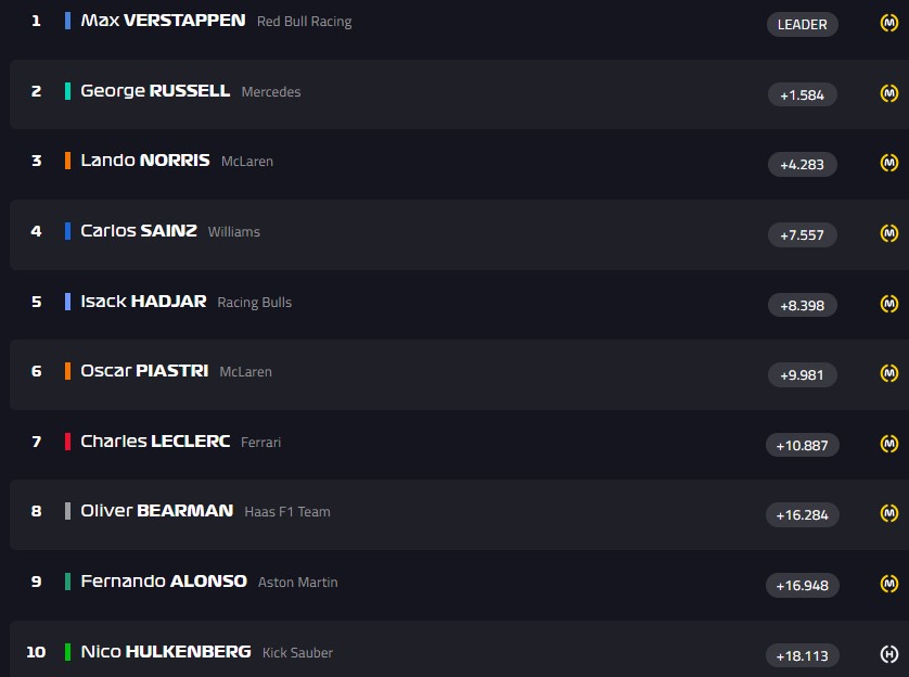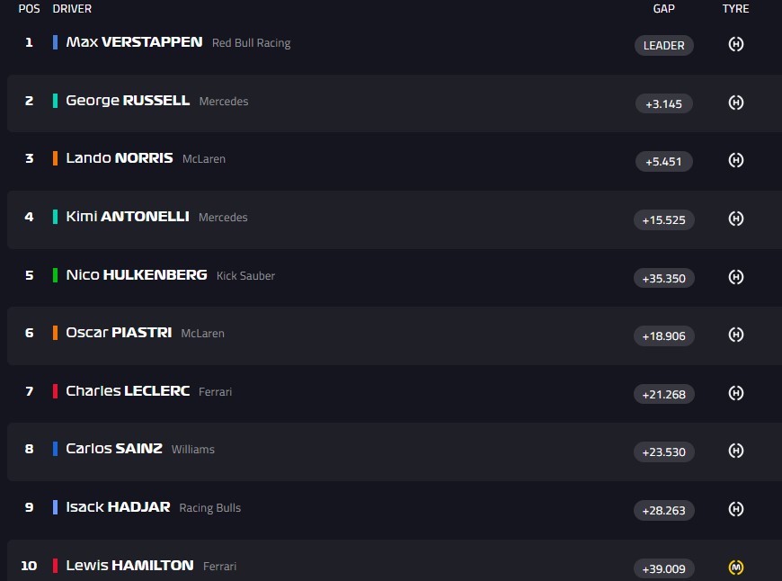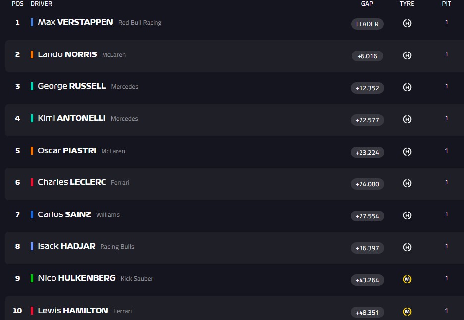 Финиш! Ферстаппен первый, Норрис - второй, Рассел - третий. Пиастри - четвёртый, Антонелли - пятый, Леклер - шестой.