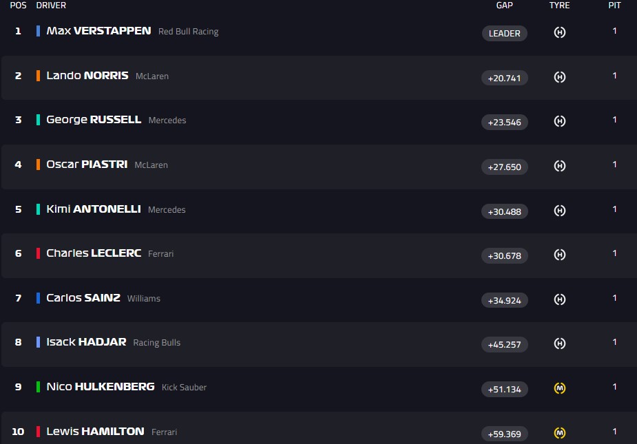 Финиш! Ферстаппен первый, Норрис - второй, Рассел - третий. Пиастри - четвёртый, Антонелли - пятый, Леклер - шестой.
