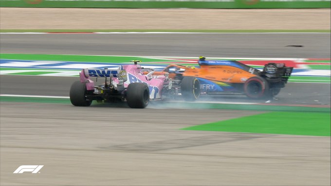 Норрис после встречи со Строллом заезжает в боксы, Стролл тоже сворачивает в боксы.