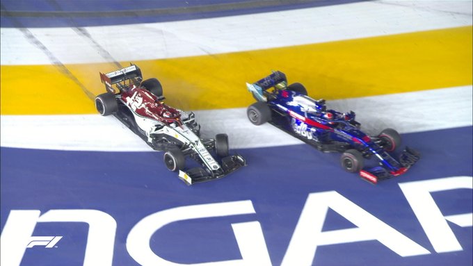 Райкконен(Alfa Romeo) становится жертвой Квята и ломается передняя подвеска у финна. Как бы штрафа не было у Квята.