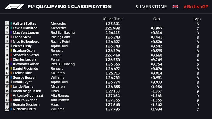 В заключительный сегмент квалификации не проходят: Нико Хюлькенберг (Racing Point), Пьер Гасли и Даниил Квят (Alpha Tauri), Джордж Расселл (Williams).