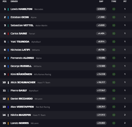 1 круг прошёл и уже Хэмилтон на пит-стоп ушёл, сменил шины и вышел последним.