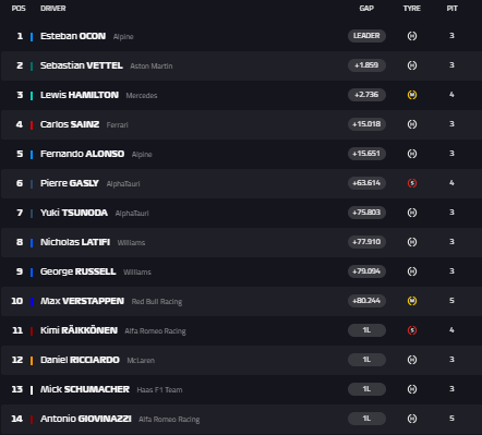 7.6 секунд до Феттеля Хэмилтону. Также Сайнс теперь борется за 4 место с Алонсо.