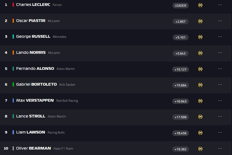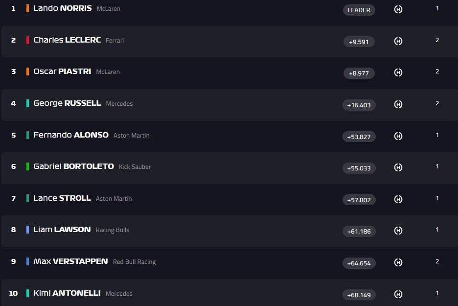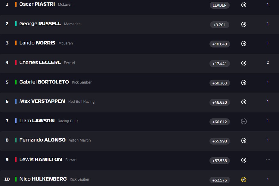На пит-стоп ушли Леклер и Пиастри, они на втором и третьем месте. Также остановился Рассел - 5-е место. У всех хард.